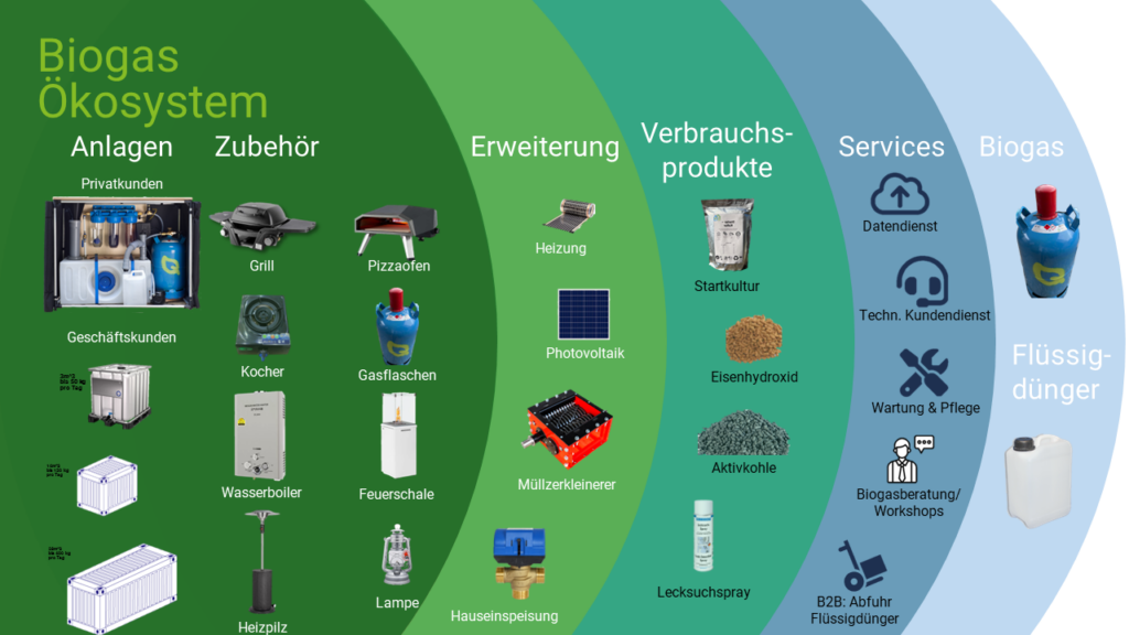 Das BalkonGas Ökosystem, bestehend aus Anlagen, Zubehör, Erweiterungen für die Anlagen, Verbrauchsprodukte für den Anlagenbetrieb, Dienstleistungen und den Rohstoffgütern wie Biogas/Biomethan und Flüssigdünger.